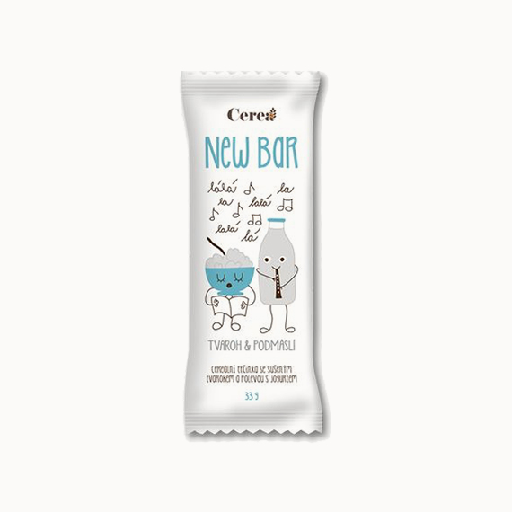 Cereal bar with dried cottage cheese and yoghurt zig zag topping. Cottage cheese is especially rich in full proteins which contain a balanced mixture of all amino acids.